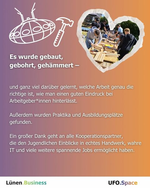 „Das Projekt UFO.Space Lünen hat gezeigt, was möglich ist, wenn Handwerk und Jugend sich auf Augenhöhe begegnen. Auch wenn das Projekt nun endet, wirken die Erfahrungen, Kompetenzen und neu entstandenen Perspektiven weit über die Projektlaufzeit hinaus. Die Jugendlichen haben erlebt, dass ihr eigenes Tun wirksam ist, und dabei viel über die richtige Berufswahl und den ersten Eindruck bei Arbeitgeber*innen gelernt.“ – Hatice Müller-Aras. Ein großer Dank gilt allen Kooperationspartnern, die diese Einblicke und Möglichkeiten ermöglicht haben. Hatice Müller-Aras und Sabine Zabel, die das Projekt begleitet haben, bleiben dem WZL erhalten.
